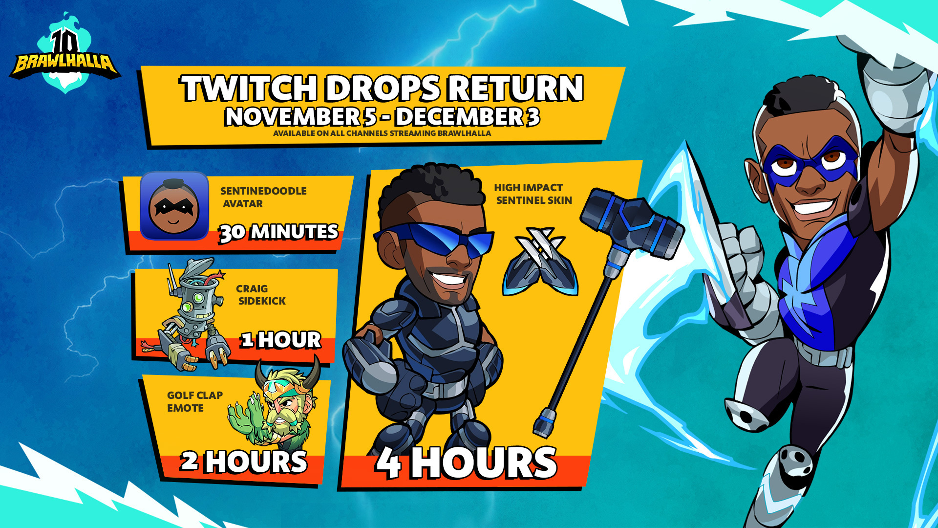 Streamers, this Drops campaign will be available category-wide if you’re eligible for Drops, you’re in. Viewers, watch anybody streaming Brawlhalla on Twitch with Drops enabled to earn rewards.