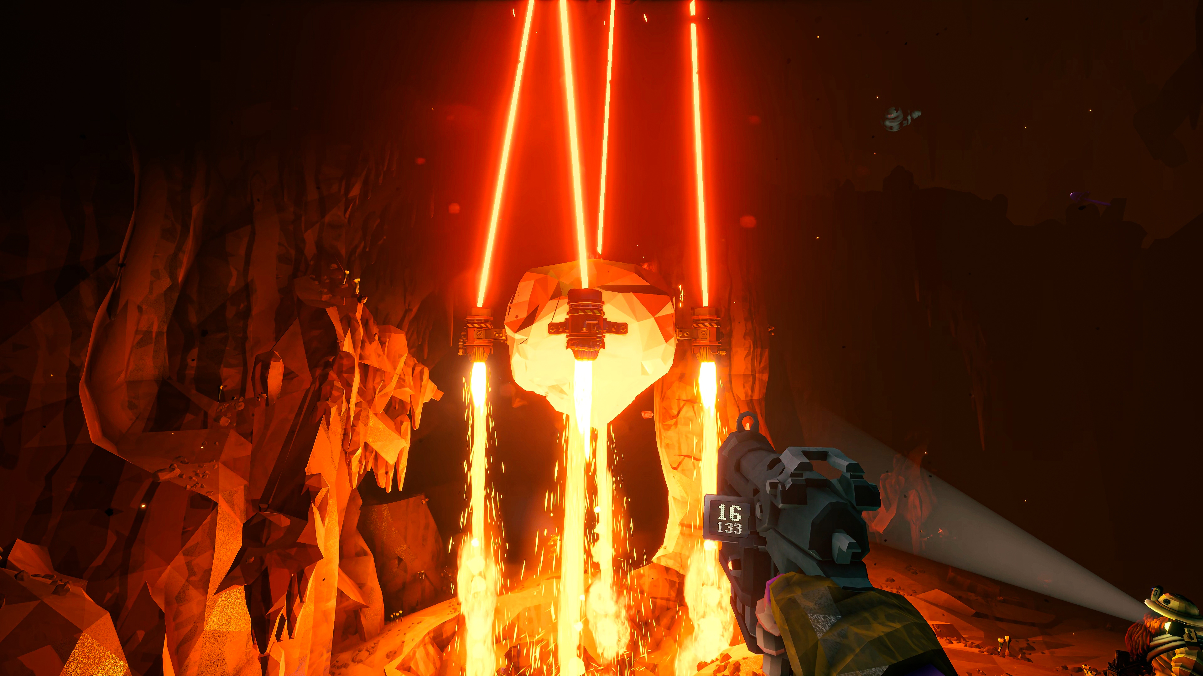 Finally, it’s time for extraction! Mission Control will send down a Lift Pod containing four heavy lift rockets. Fix the rockets to the Resinite Mass, then keep your beards clear of the launch zone as the lasers carve a path upwards for orbital extraction.