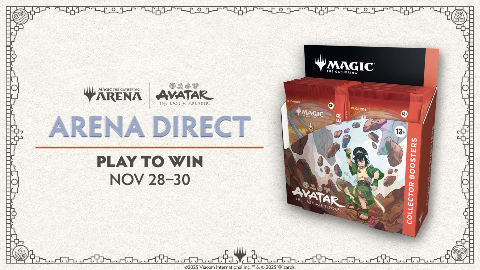 Enter the upcoming Arena Direct, beginning November 28, and you could win a Magic: The Gathering | Avatar: The Last Airbender Collector Booster box!