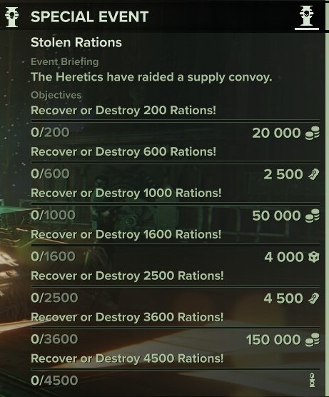 To make progress in the event, you need to play missions with the Stolen Rations conditions where you will encounter ration items throughout. As you do, you will have to choose if you want to recover or destroy them (and face the consequences). Your event progress is strike team wide, and will be granted regardless of what option you choose.